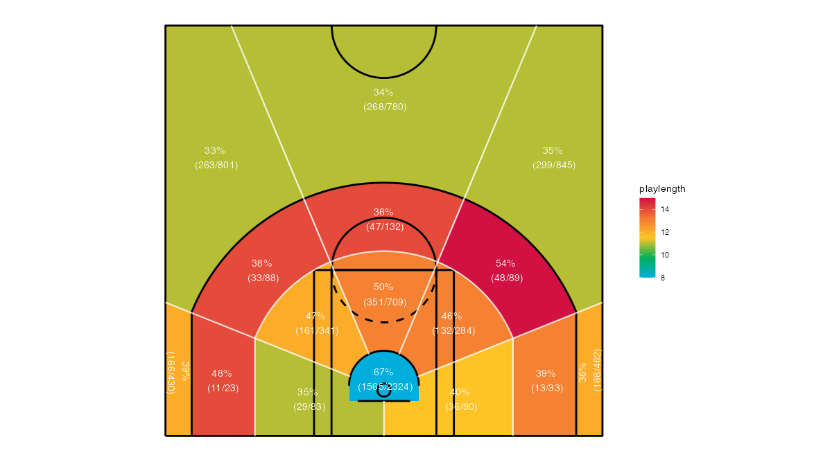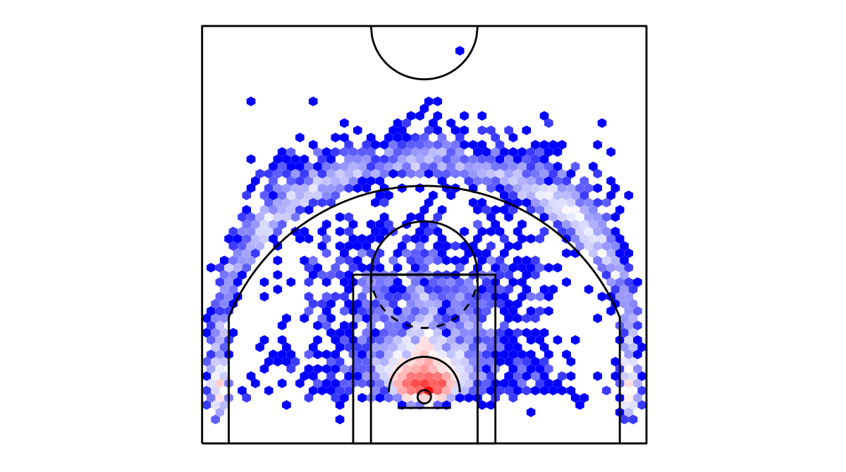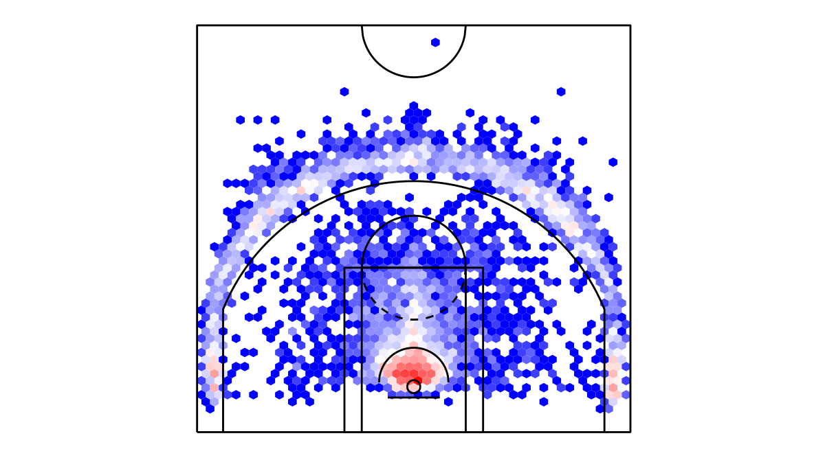ヘックスビンマップ(Hexbin map)を用いたニューオーリンズ・ペリカンズのシュートチャートは下記の通り。シュートチャートの見方はこちら