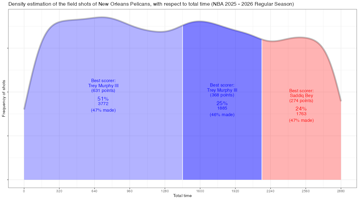 試合経過時間で見るニューオーリンズ・ペリカンズのフィールドショットの分布は下記の通り。分布図の見方はこちら
