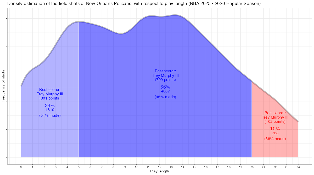 ショットクロックで見るニューオーリンズ・ペリカンズのフィールドショットの分布は下記の通り。分布図の見方はこちら