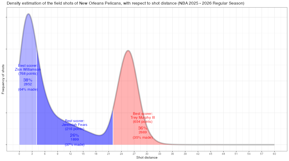 シュート距離で見るニューオーリンズ・ペリカンズのフィールドショットの分布は下記の通り。分布図の見方はこちら