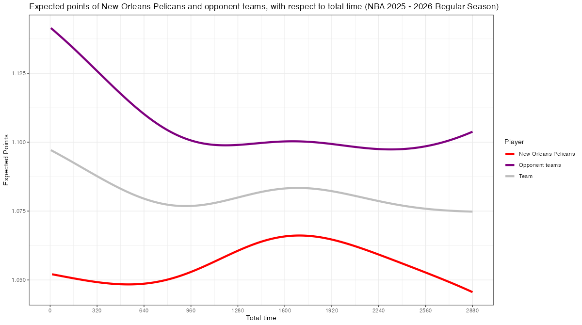 試合経過時間で見るニューオーリンズ・ペリカンズのスコアリング期待値の推移は下記の通り。分布図の見方はこちら
