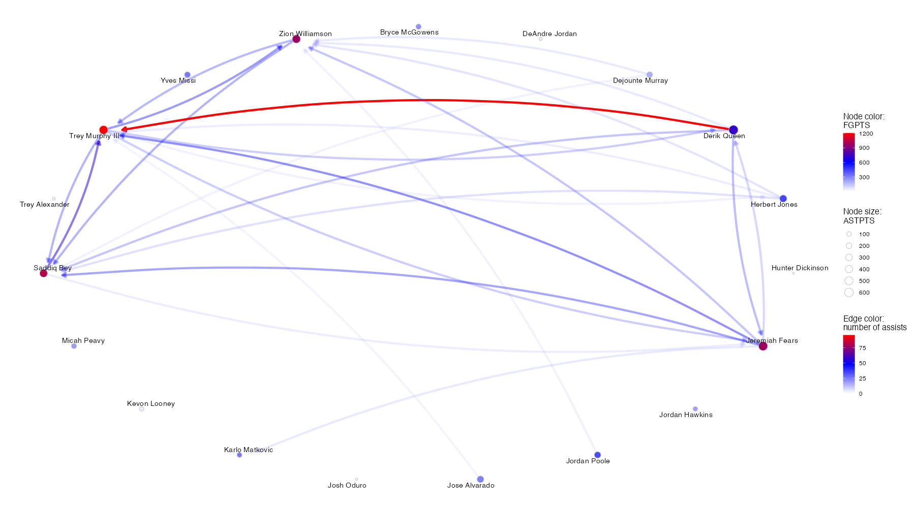 ニューオーリンズ・ペリカンズのアシストネットワークは下記の通り。グラフ内に示されている項目やグラフの見方はこちら