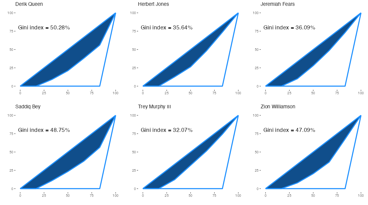 ニューオーリンズ・ペリカンズの所属プレイヤーについて、アシストを出した相手先の偏りを表すジニ係数は下記の通り。ジニ係数の内容は過去記事を参照