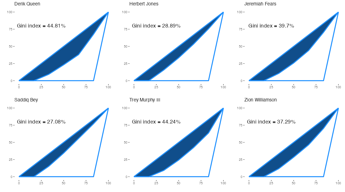 Lorenz curves and Gini indexes for assists received, New Orleans Pelicans’ players <NBA 2025 – 2026 Regular season>