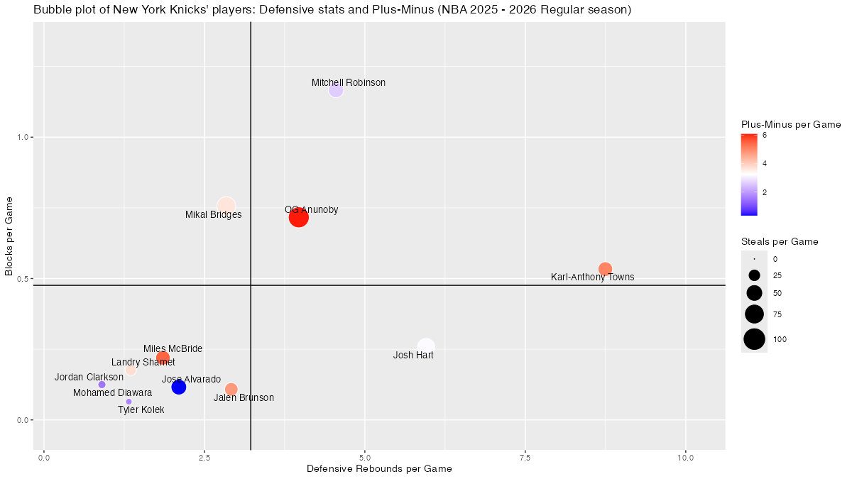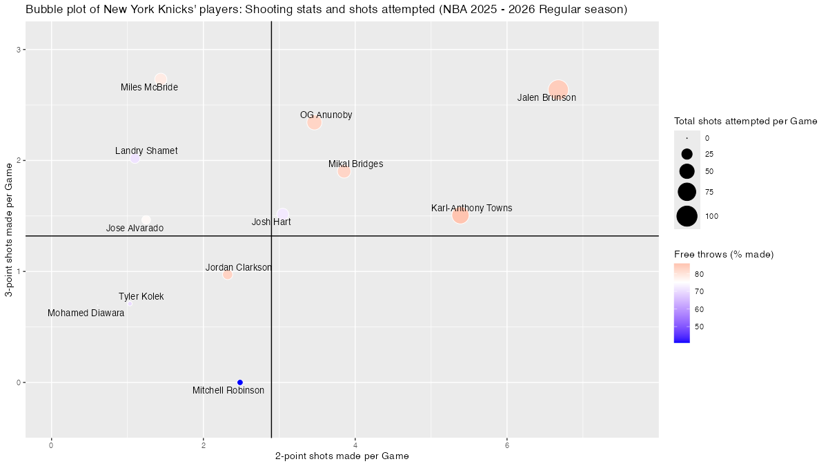【ニューヨーク・ニックス】基本スタッツを用いたプレイヤーのバブルチャート <NBA 2025 – 2026 Regular Season>