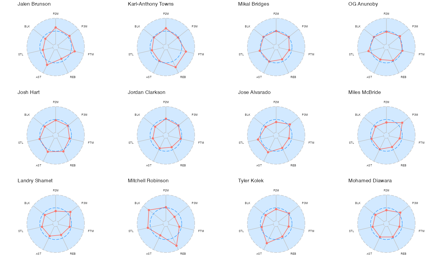 ニューヨーク・ニックスの所属プレイヤーのレーダーチャートは下記の通り。レーダーチャートの見方はこちら。基本スタッツの内容はこちら。