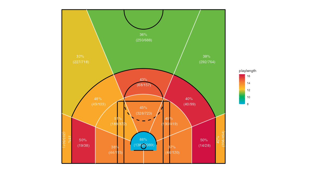 コートを16エリアに区分したニューヨーク・ニックスの対戦チームのシュートチャートは下記の通り。シュートチャートの見方はこちら。