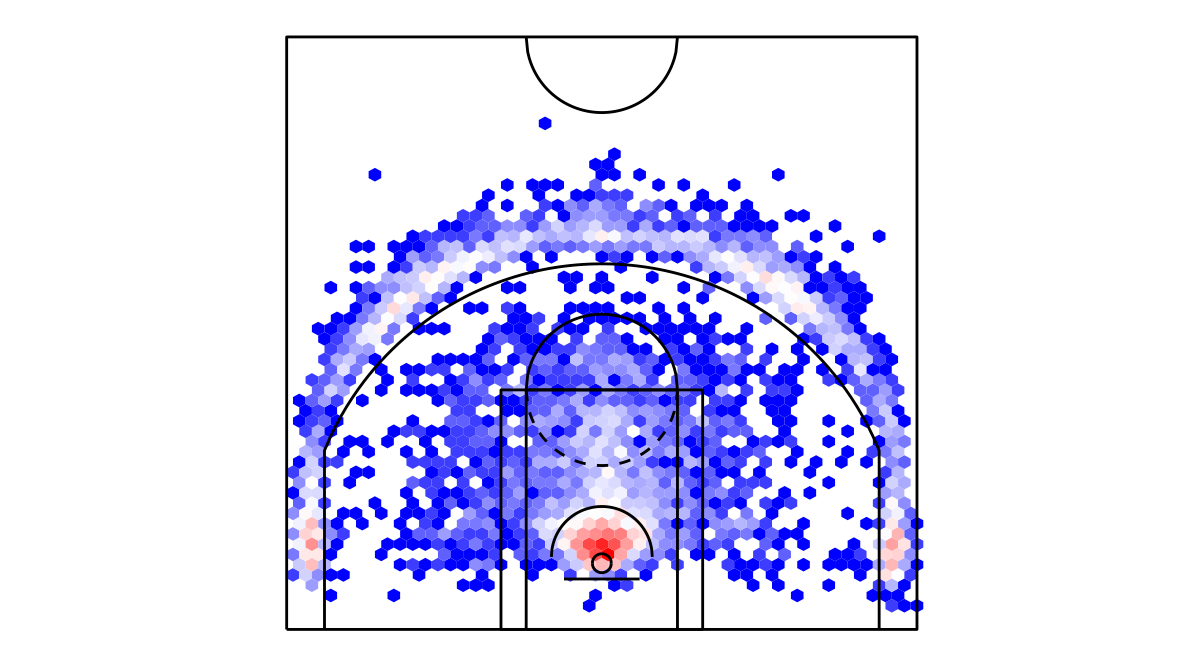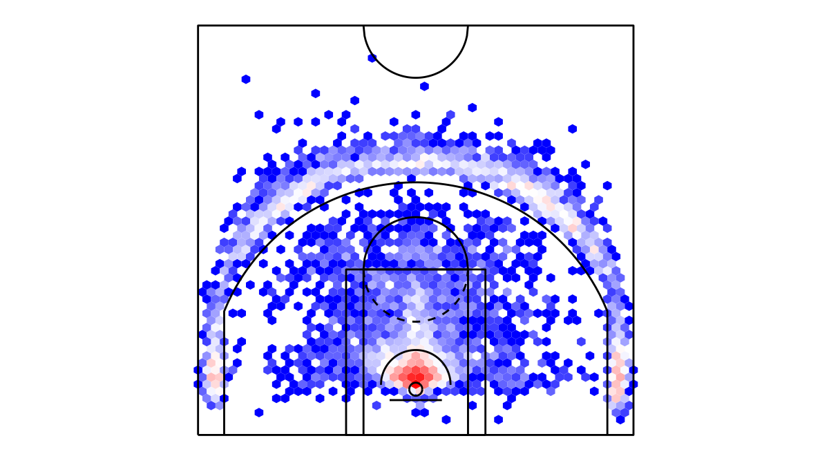 ヘックスビンマップ(Hexbin map)を用いたニューヨーク・ニックスの対戦チームのシュートチャートは下記の通り。シュートチャートの見方はこちら。