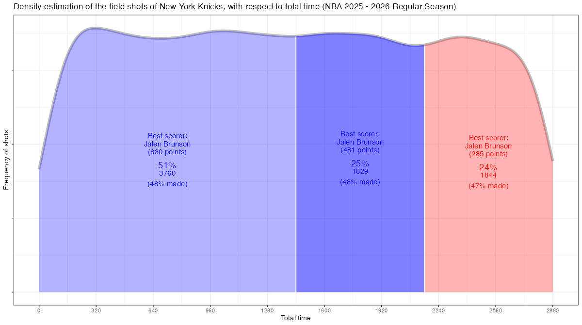 試合経過時間で見るニューヨーク・ニックスのフィールドショットの分布は下記の通り。分布図の見方はこちら。