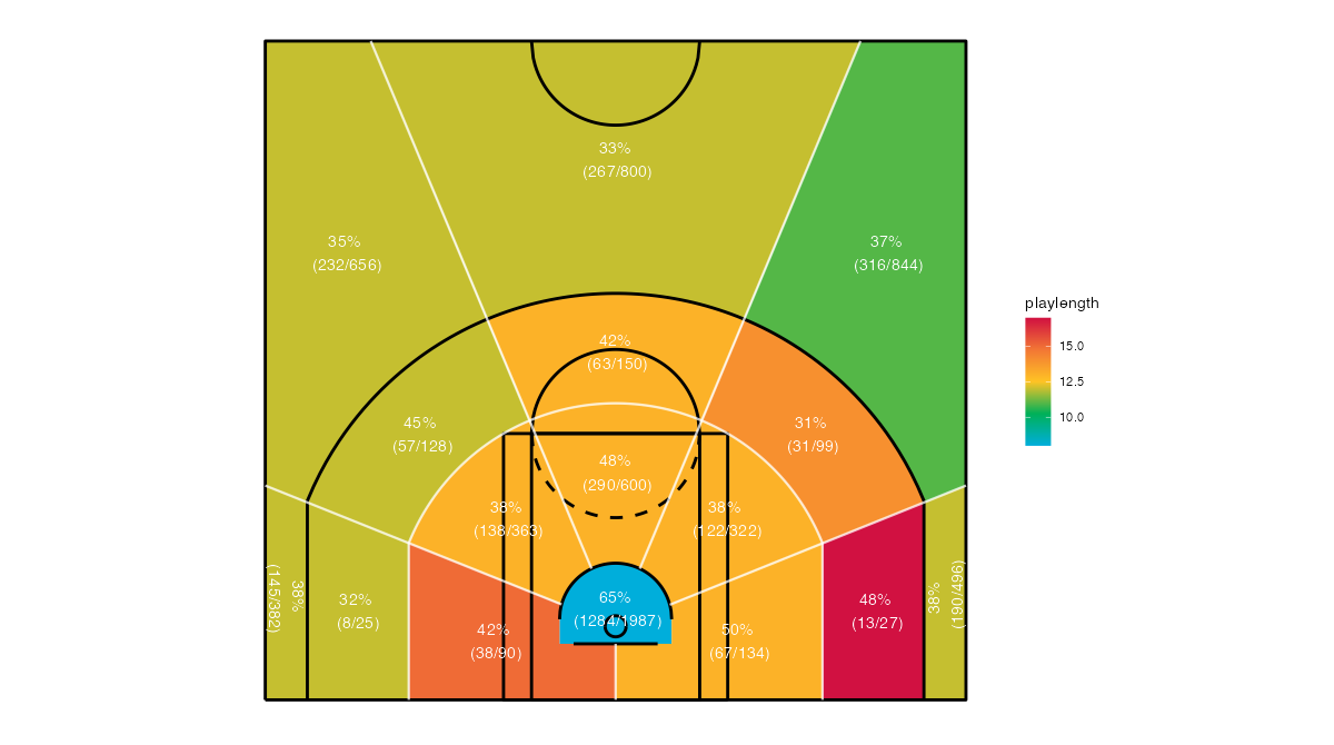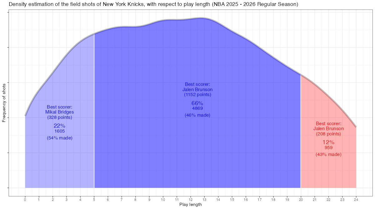 ショットクロックで見るニューヨーク・ニックスのフィールドショットの分布は下記の通り。分布図の見方はこちら。