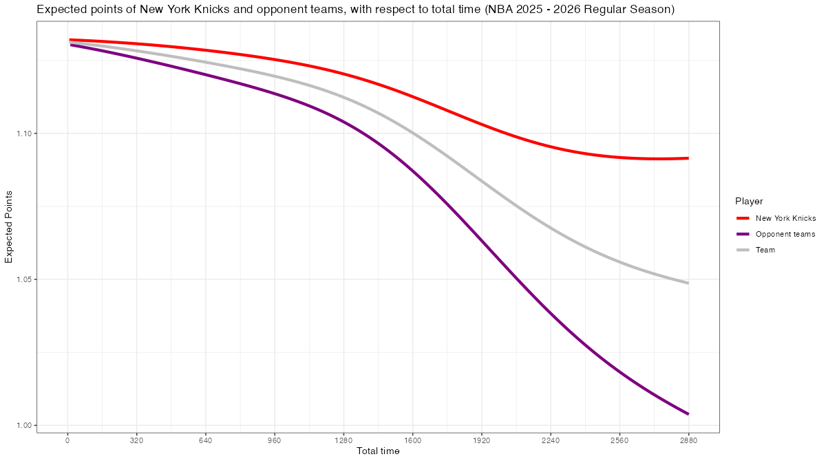 試合経過時間で見るニューヨーク・ニックスのスコアリング期待値の推移は下記の通り。分布図の見方はこちら。