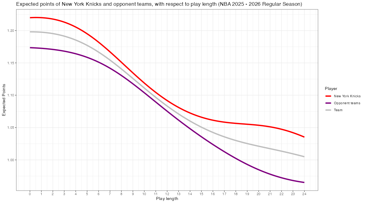 ショットクロックで見るニューヨーク・ニックスのスコアリング期待値の推移は下記の通り。分布図の見方はこちら。