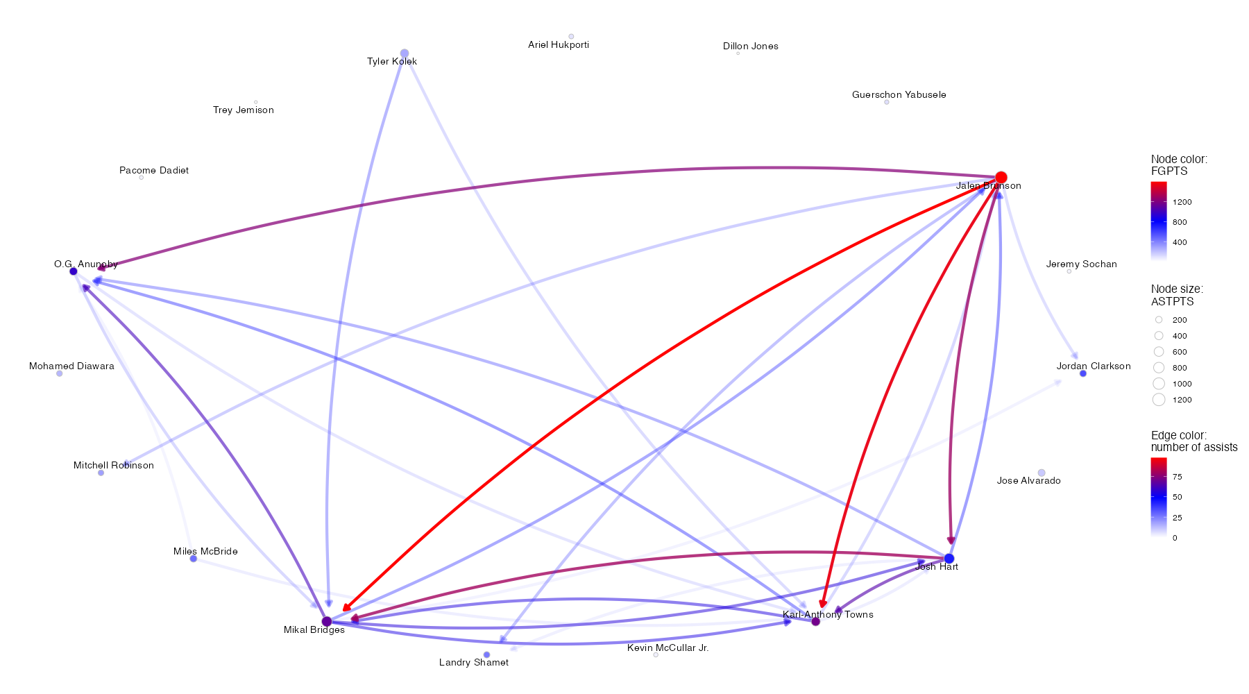 ※ノードの色はFGPTS(フィールドショットによる得点)、ノードのサイズはASTPTS(アシストにより生み出した得点)に対応している。エッジの始点はアシスト元のプレイヤー、終点はアシスト先のプレイヤー、エッジの色はアシスト数(アシスト数20以下となるエッジの表記は省略)に対応している。