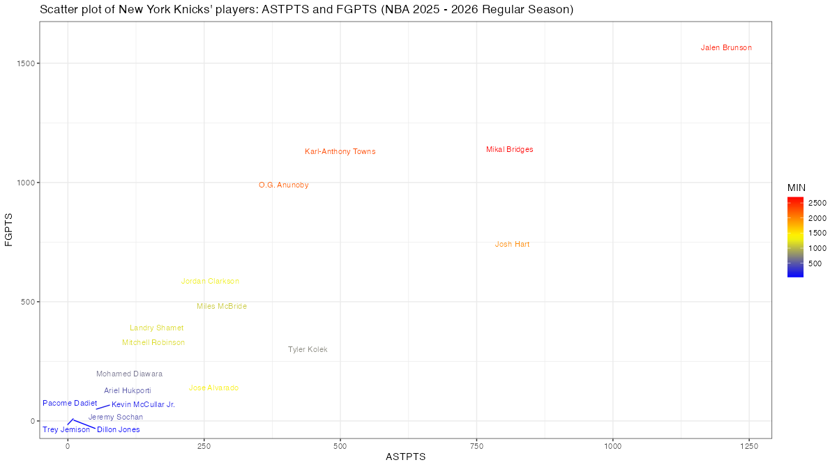 ニューヨーク・ニックスの所属プレイヤー(アルファベット順)のフィールドショットによる得点とアシスト関連スタッツは下記の通り。表中のFGPTS, FGPTS_AST, FGPTS_ASTp, AST, ASTPTSの内容はこちら。