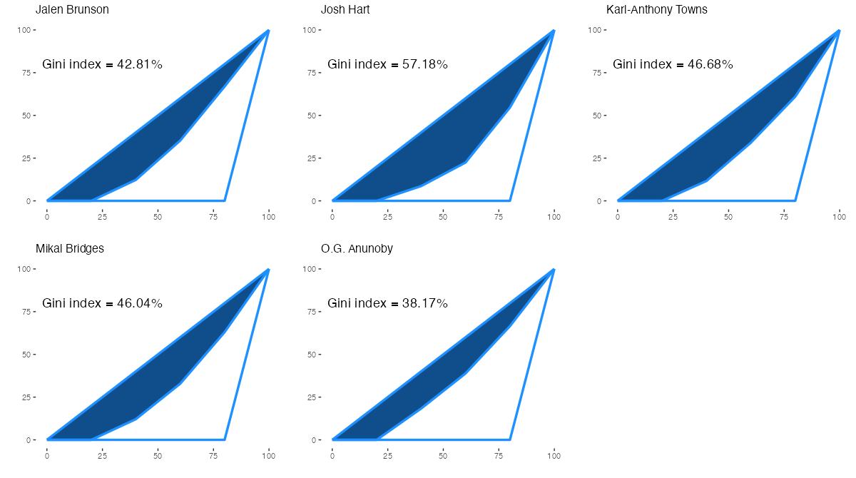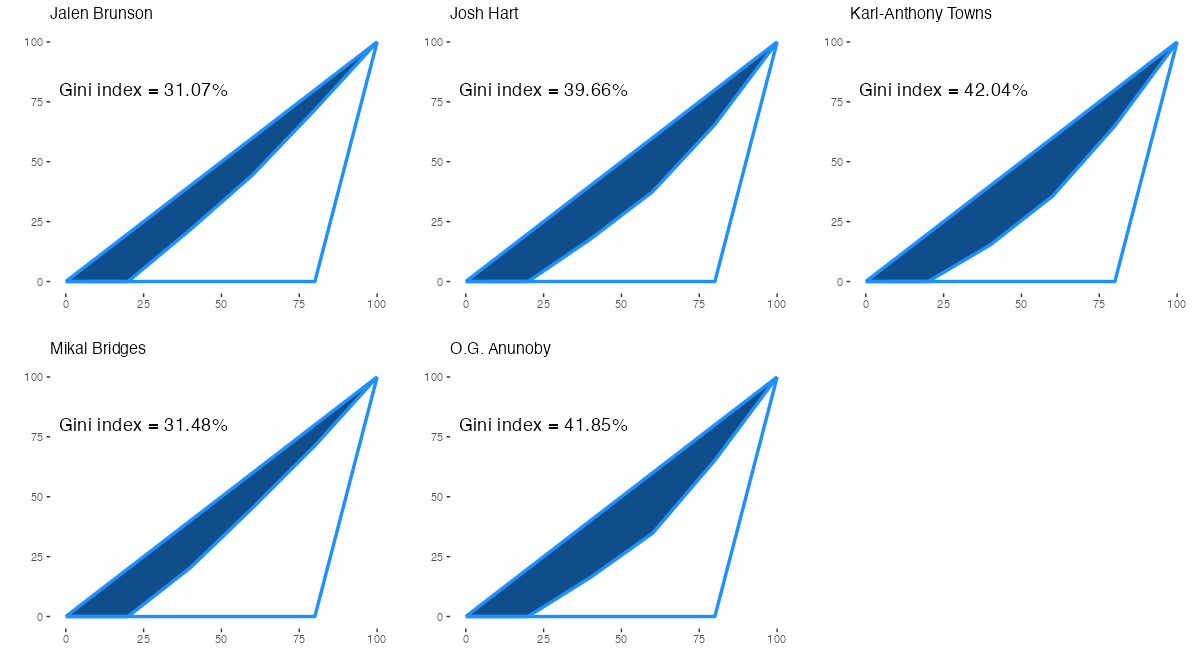 ニューヨーク・ニックスの所属プレイヤーについて、アシストをもらった相手の偏りを表すジニ係数は下記の通り。ジニ係数の内容は過去記事を参照。