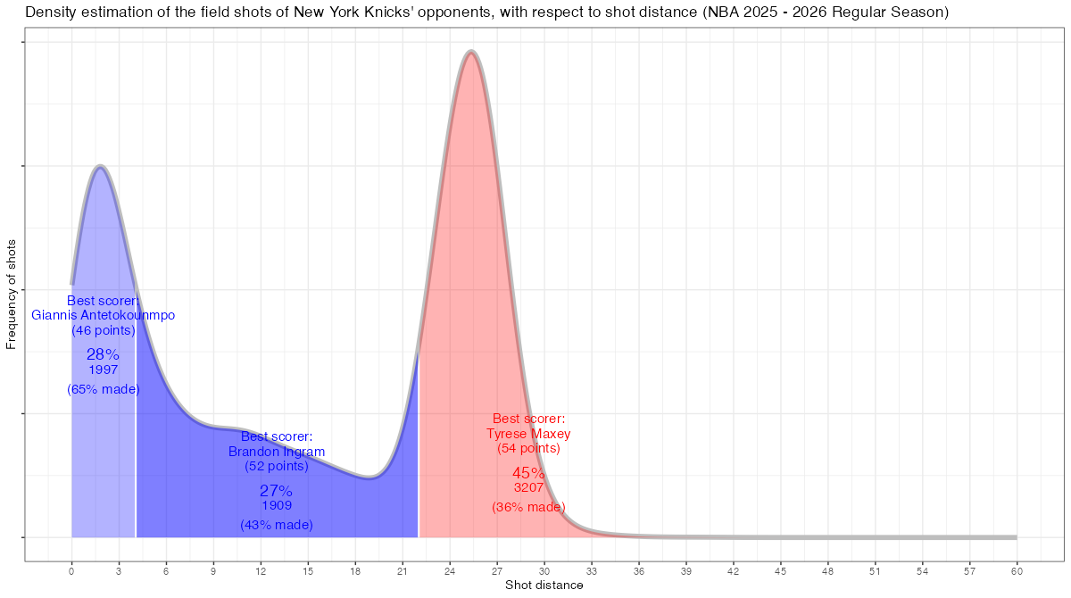 シュート距離から見るニューヨーク・ニックスの対戦チームのフィールドショットの分布は下記の通り。分布図の見方はこちら。