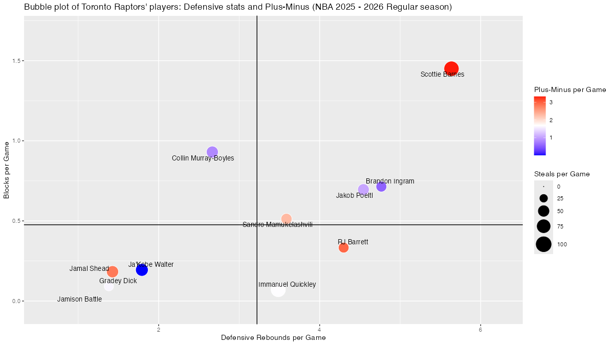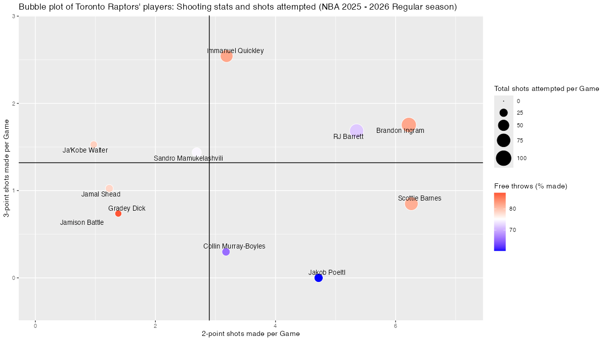 【トロント・ラプターズ】基本スタッツを用いたプレイヤーのバブルチャート <NBA 2025 – 2026 Regular Season>