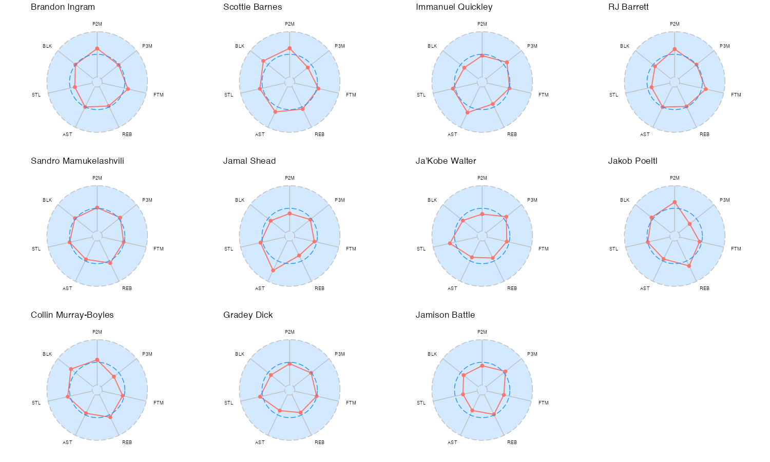 | RJ Barrett | 22 | 46 | 7 | 0 | 18 | 37 |