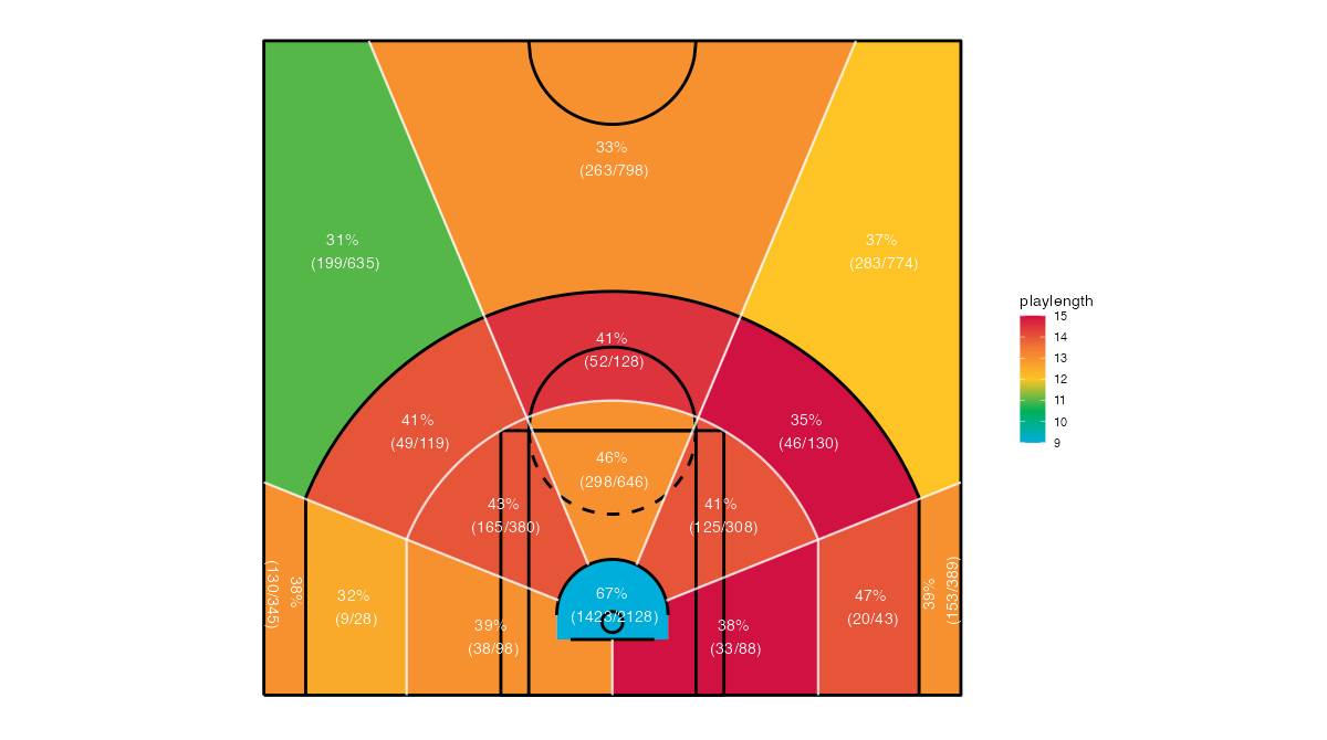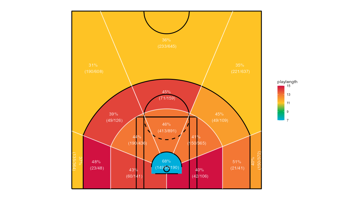 ショットクロックで見るトロント・ラプターズのフィールドショットの分布は下記の通り。分布図の見方はこちら。