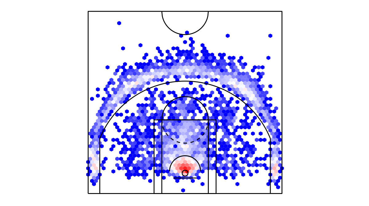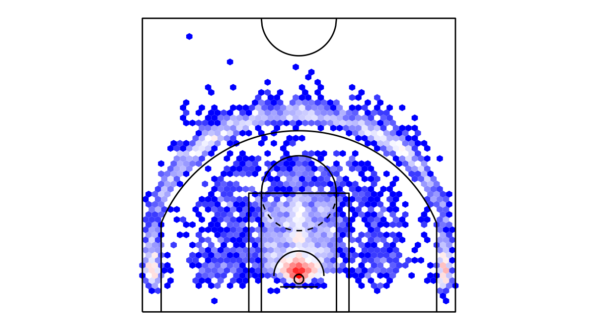 ヘックスビンマップ(Hexbin map)を用いたトロント・ラプターズのシュートチャートは下記の通り。シュートチャートの見方はこちら。