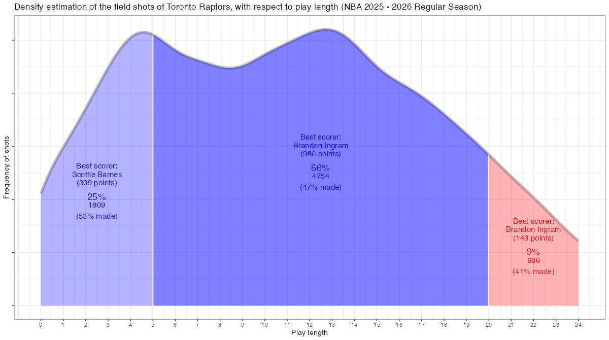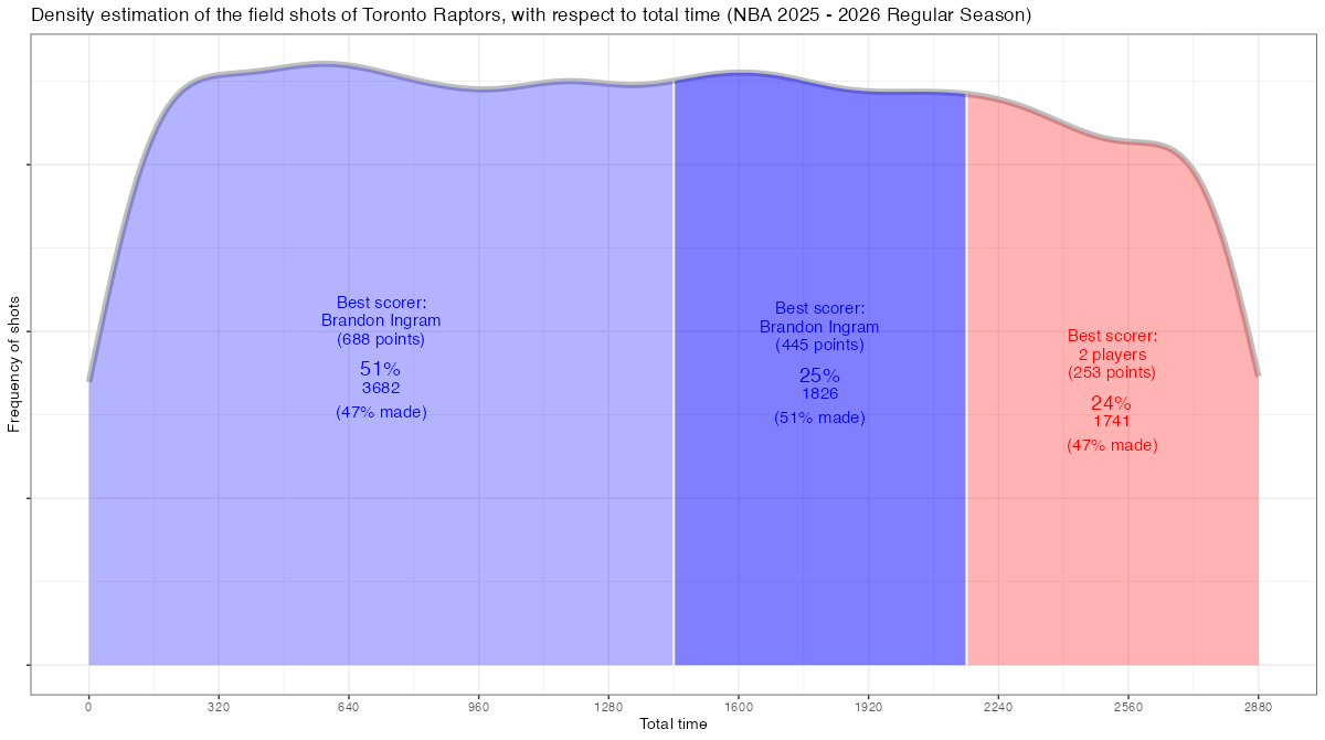 試合経過時間で見るトロント・ラプターズのフィールドショットの分布は下記の通り。分布図の見方はこちら。