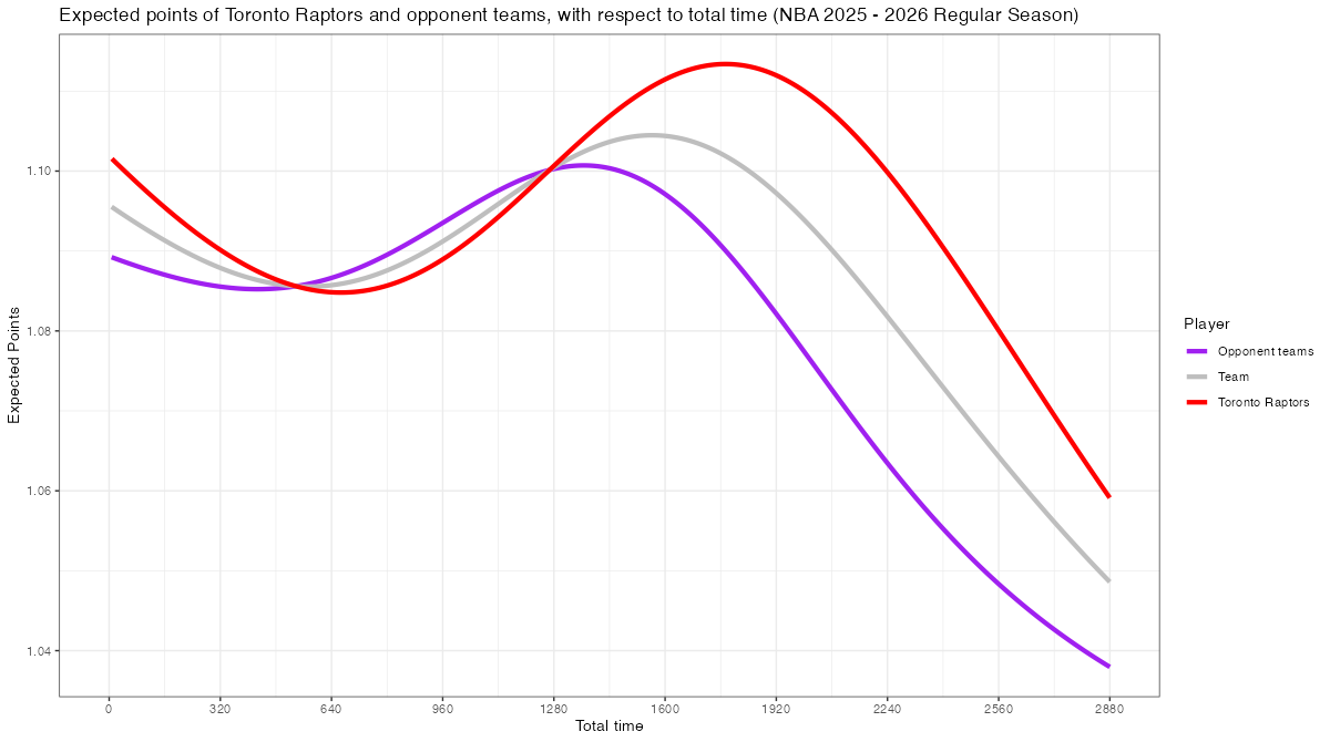 試合経過時間で見るトロント・ラプターズのスコアリング期待値の推移は下記の通り。分布図の見方はこちら。