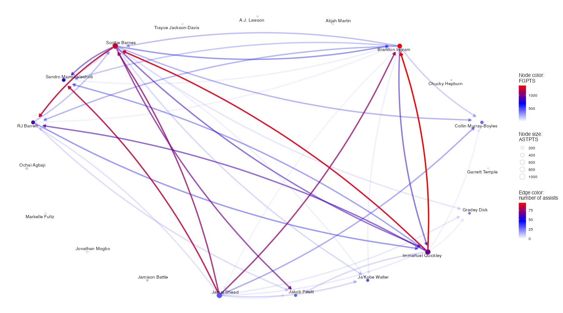 ※ノードの色はFGPTS(フィールドショットによる得点)、ノードのサイズはASTPTS(アシストにより生み出した得点)に対応している。エッジの始点はアシスト元のプレイヤー、終点はアシスト先のプレイヤー、エッジの色はアシスト数(アシスト数20以下となるエッジの表記は省略)に対応している。