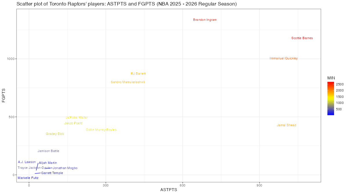 トロント・ラプターズの所属プレイヤー(アルファベット順)のフィールドショットによる得点とアシスト関連スタッツは下記の通り。表中のFGPTS, FGPTS_AST, FGPTS_ASTp, AST, ASTPTSの内容はこちら。