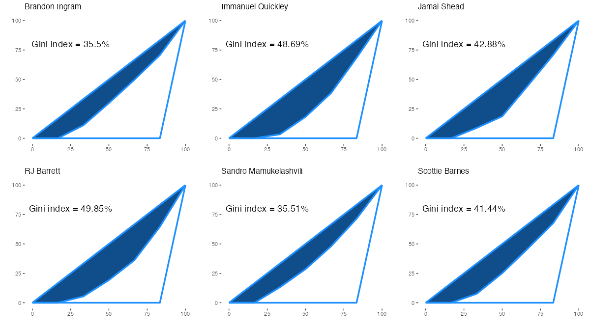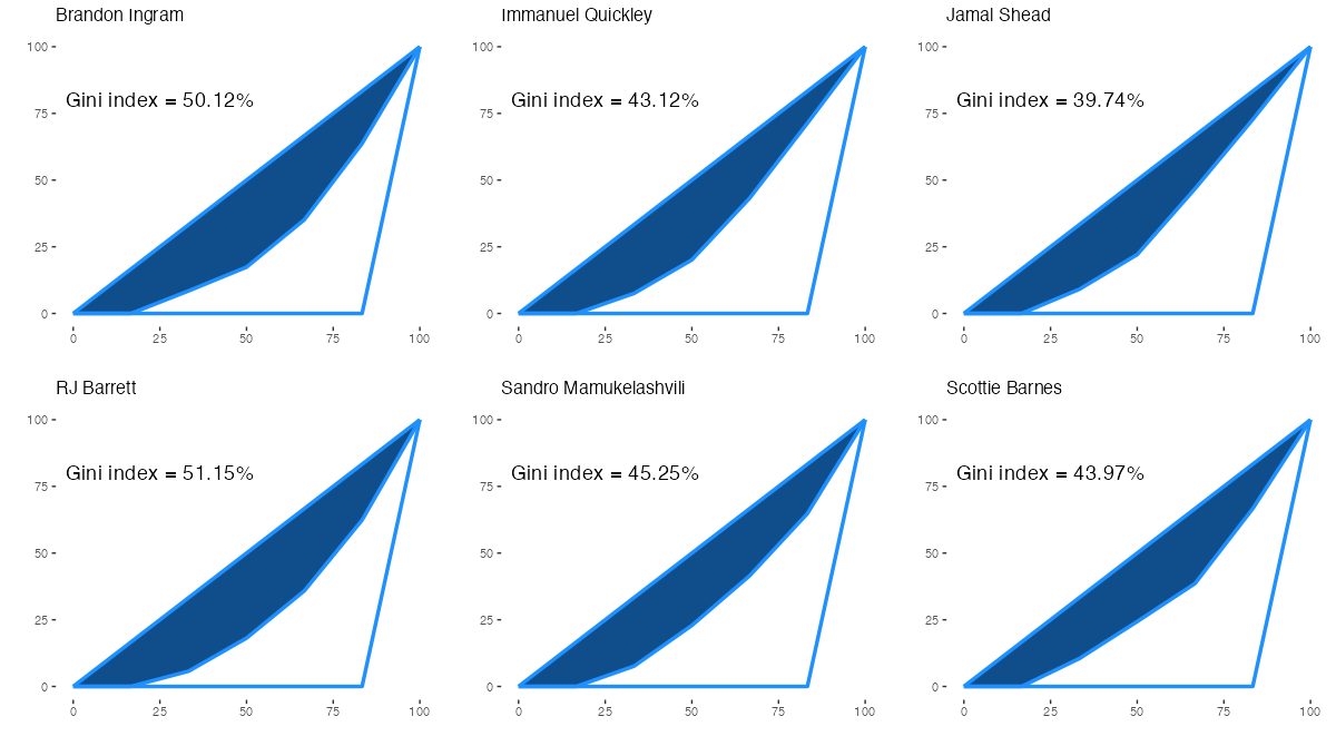 トロント・ラプターズの所属プレイヤーについて、アシストをもらった相手の偏りを表すジニ係数は下記の通り。ジニ係数の内容は過去記事を参照。